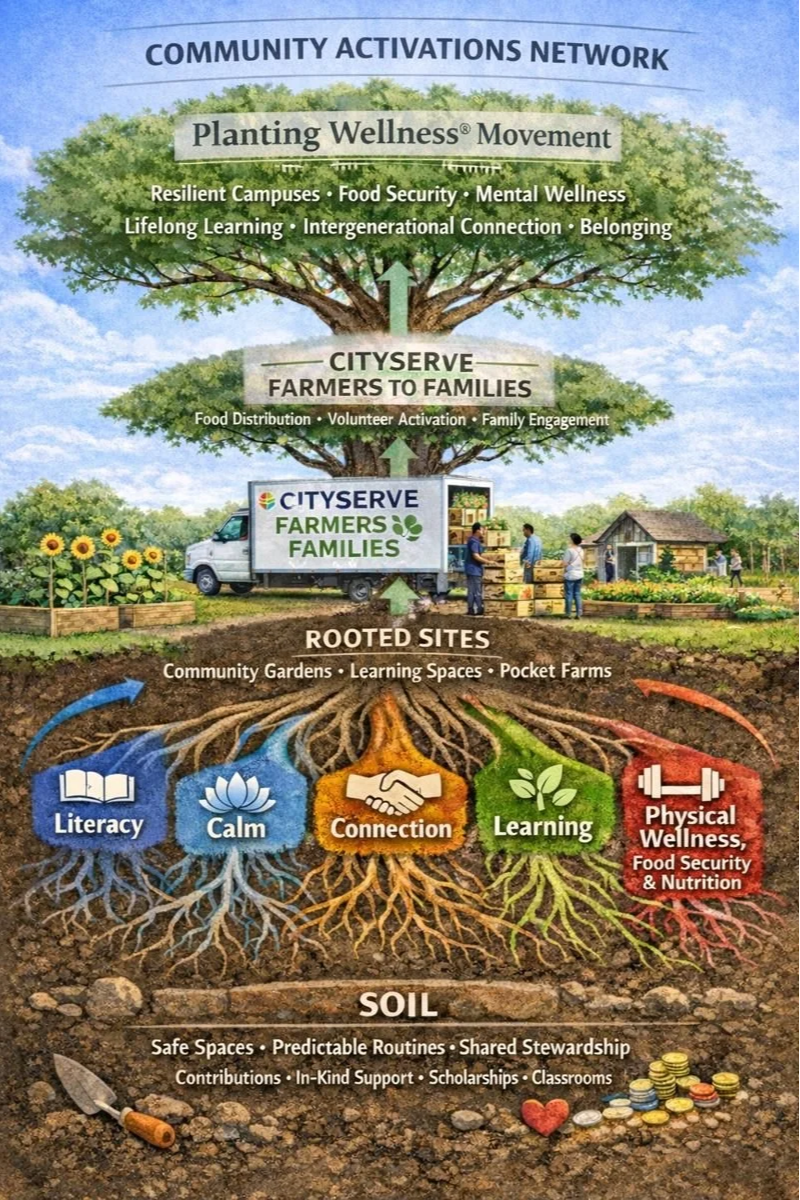 Planting Wellness® is a Community Activations Network–led movement that uses planting and gardening to bring learning spaces, mental wellness, food security, and intergenerational community collaboration together.